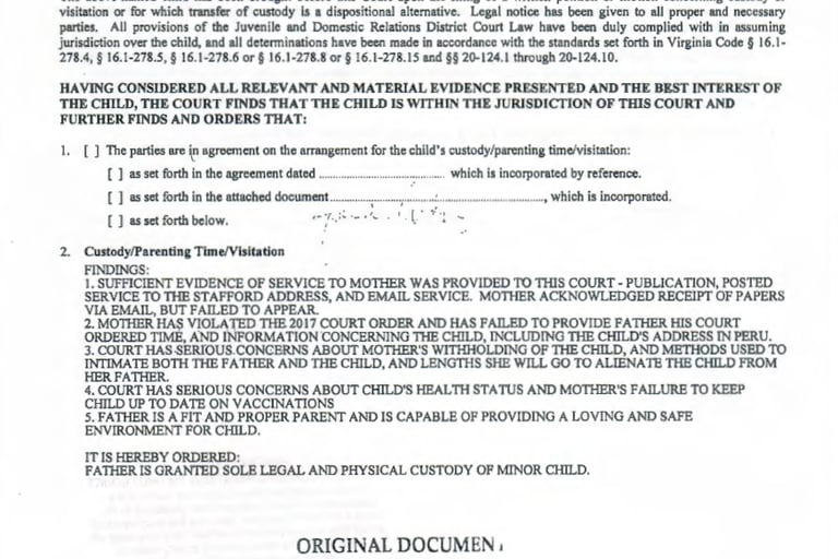 In July of 2022 after numerous hearings and delays, the Fairfax County Juvenile and Domestic Relations Court awarded full legal and physical custody of Anna to me. The judge noted it was one of the most egregious cases she had ever seen. The court also ordered Magali to pay part of my legal fees. When Magali refused to comply with the order to return Anna, the Commonwealth of Virginia issued a felony child abduction warrant.