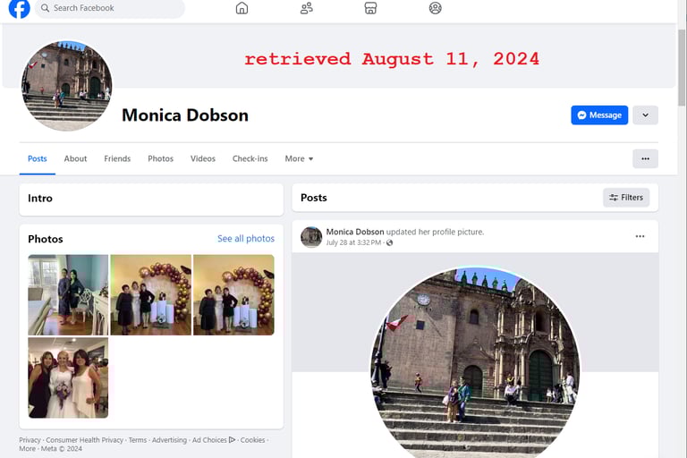 In July 2024 Monica Dobson, Anna's aunt in Delaware, uploaded a recent photo of herself with Anna in Cusco, Peru. The location of the photo is approximately 5.5 hours by car or 6 hours by bus from where Anna is purportedly living.